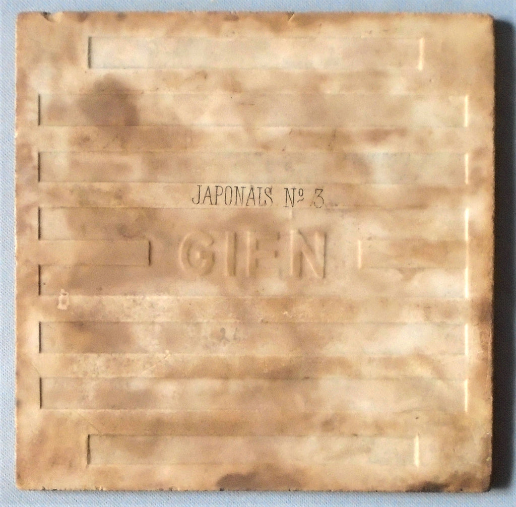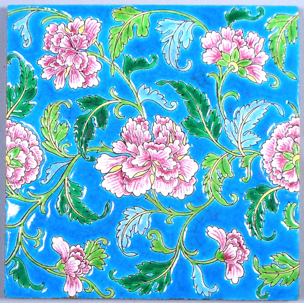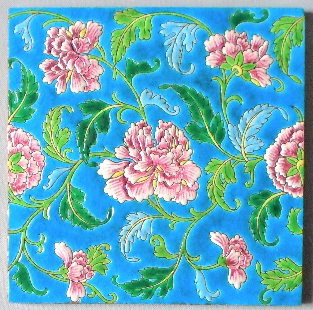 A beautiful tile in the emaux cloisonné technique of lovely pink peony flowers amid gracefully swirling stems and leaves against a brilliant blue background. Made by Gien in the Loire Valley of France during the late 19th century they were contemporaries of Longwy and Creil-Monterau in making these wonderful ceramic versions of Eastern cloisonné metal. The "Japanese" tile measures 7 3/4" square and 3/8" thick. The back is marked "GIEN" and " Japonais No 3" and is in very good condition with slight wear to the high points of the blue decoration and a small chip on the upper right corner.
